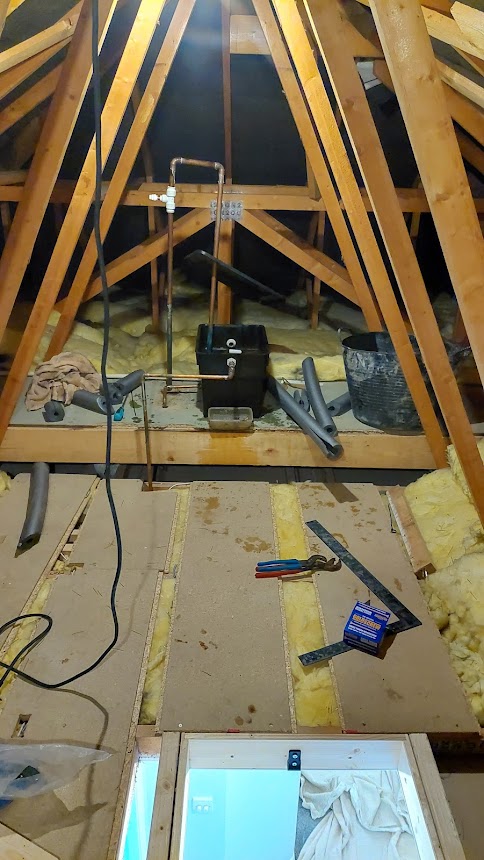 Loft storage can be a really useful solution. It creates economical extra floor space for the things you want to keep hold – nut don’t always use – at home. We have seen people using converted loft storage space for clothes, extra bedding, tools, spaces to store beer fermenting barrels, old vinyls, heirlooms, bikes, Christmas decorations and more. When we went to meet Andy and survey this loft in Simmondley, there was a problem of a gravity-fed water tank hogging the space.